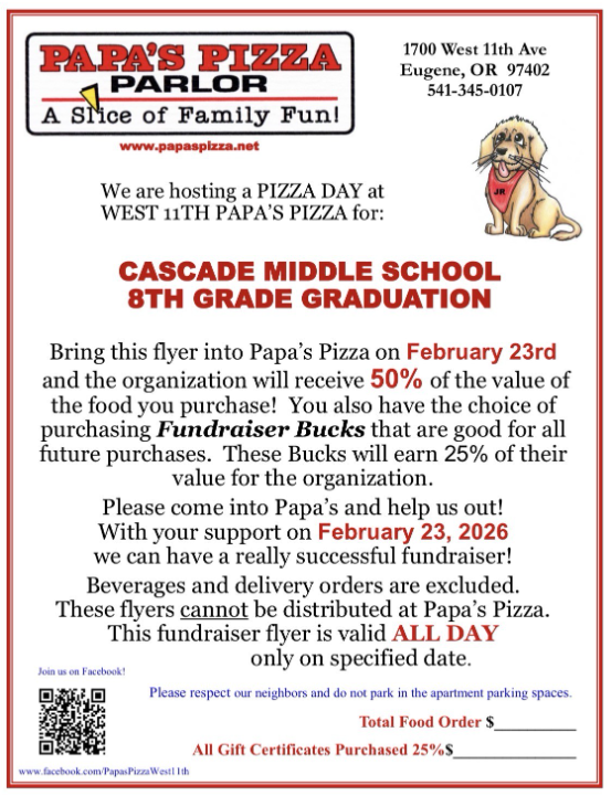 Cascade Families,All proceeds go to support 8th grade end of year activities.Thanks in advance for your support.